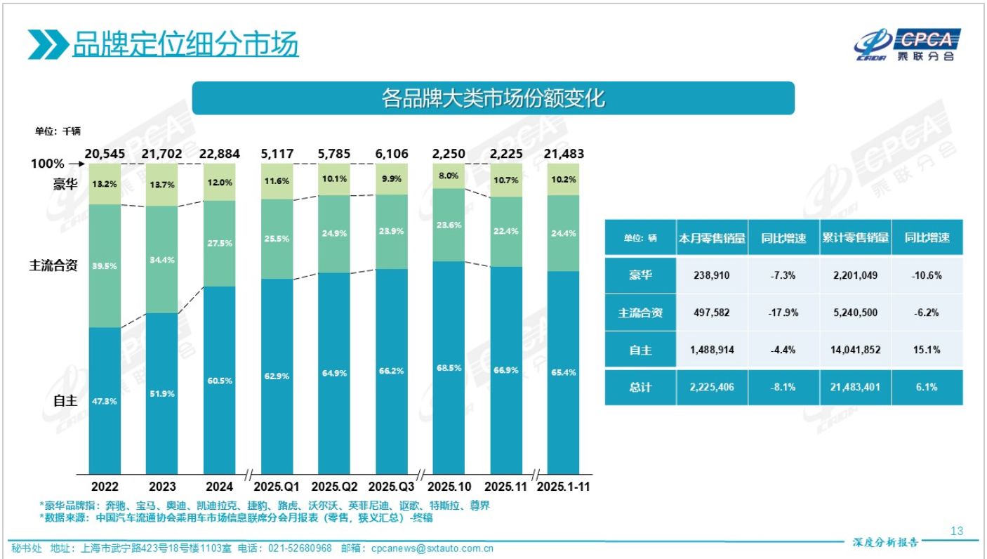 据乘联分会数据,2025年前11个月,国内豪华品牌累计销量约220.1万辆,同比下滑10.6%。