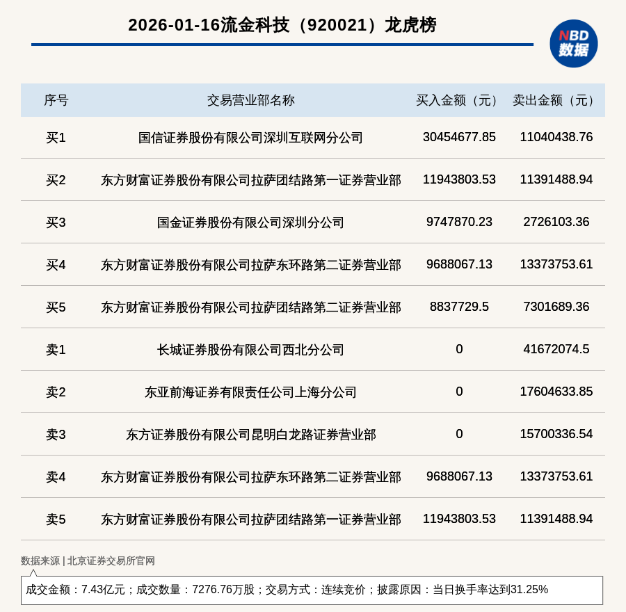 每经讯,2026年1月16日,北交所上市公司流金科技(920021,收盘价:9.75元)登上龙虎榜,交易方式是连续竞价,披露原因是当日换手率达到31.25%,成交数量7276.76万股,成交金额7.43亿元。买一席位为国信证券股份有限公司深圳互联网分公司,买入3045.47万元;卖一席位为长城证券股份有限公司西北分公司,卖出4167.21万元。