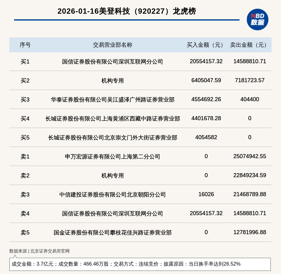 每经讯,2026年1月16日,北交所上市公司美登科技(920227,收盘价:80.85元)登上龙虎榜,交易方式是连续竞价,披露原因是当日换手率达到26.52%,成交数量466.46万股,成交金额3.7亿元。买一席位为国信证券股份有限公司深圳互联网分公司,买入2055.42万元;卖一席位为申万宏源证券有限公司上海第二分公司,卖出2507.49万元。