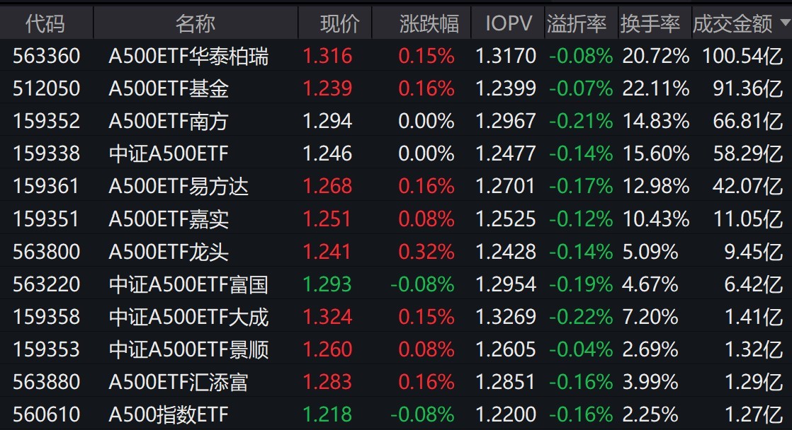 截至上午收盘,场内跟踪中证A500指数的ETF涨跌互现。其中,有12只中证A500相关ETF成交额超1亿元,2只超91亿元。A500ETF华泰柏瑞、A500ETF基金早盘成交额分别为100.54亿元、91.36亿元。