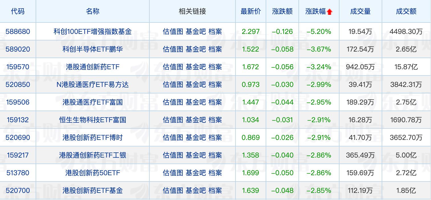 下跌方面,科创100ETF增强指数基金领跌5.20%,港股通医疗相关ETF悉数回调。