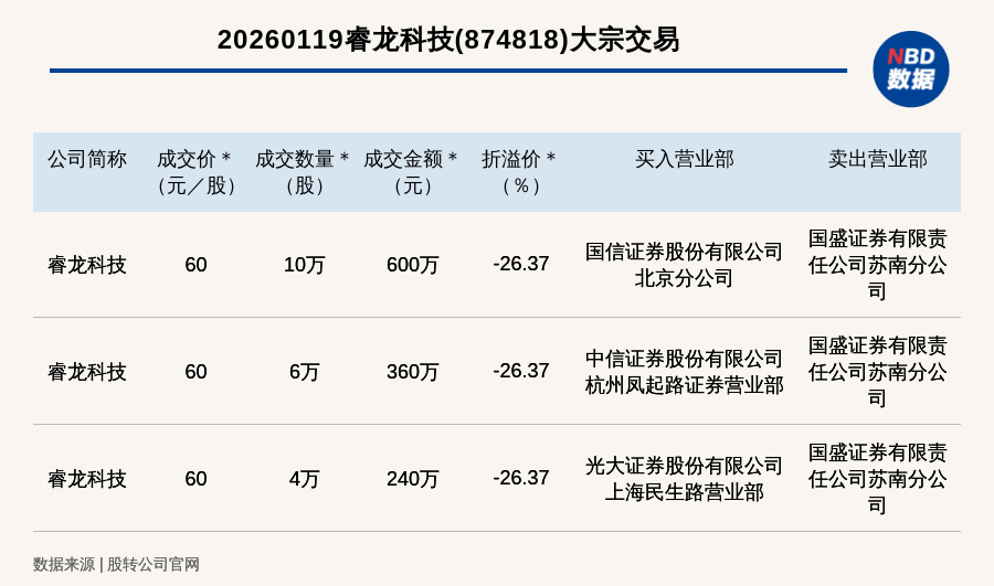 每经讯,2026年1月19日,新三板创新层公司睿龙科技(874818,收盘价:81.49元)发生3笔大宗交易,总成交金额为1200万元,成交金额最高的一笔成交价60元/股,成交数量10万股,成交金额600万元,折价26.37%。买入营业部是国信证券股份有限公司北京分公司,卖出营业部是国盛证券有限责任公司苏南分公司。