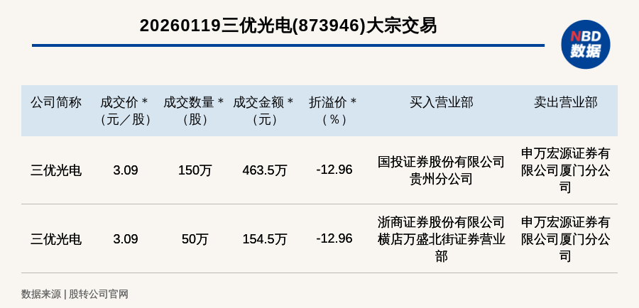 每经讯,2026年1月19日,新三板创新层公司三优光电(873946,收盘价:3.55元)发生2笔大宗交易,总成交金额为618万元,成交金额最高的一笔成交价3.09元/股,成交数量150万股,成交金额463.5万元,折价12.96%。买入营业部是国投证券股份有限公司贵州分公司,卖出营业部是申万宏源证券有限公司厦门分公司。