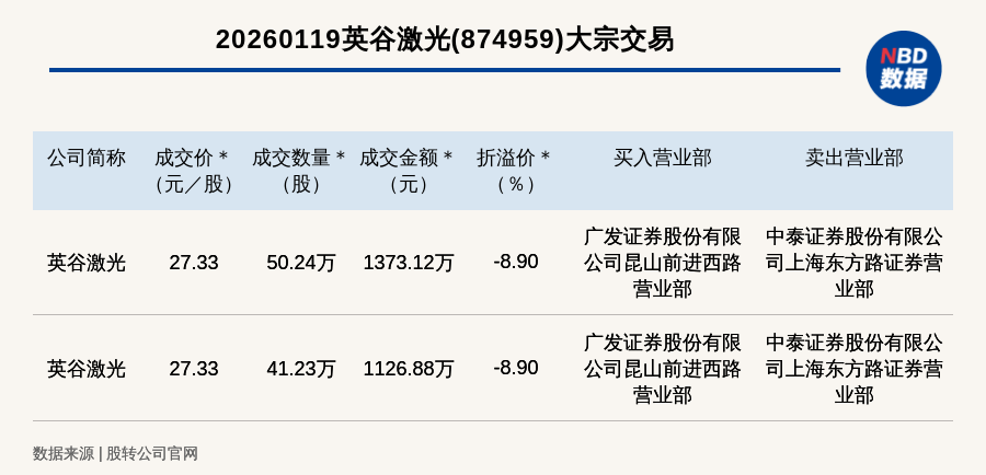 每经讯,2026年1月19日,新三板基础层公司英谷激光(874959,收盘价:30元)发生2笔大宗交易,总成交金额为2500万元,成交金额最高的一笔成交价27.33元/股,成交数量50.24万股,成交金额1373.12万元,折价8.9%。买入营业部是广发证券股份有限公司昆山前进西路营业部,卖出营业部是中泰证券股份有限公司上海东方路证券营业部。