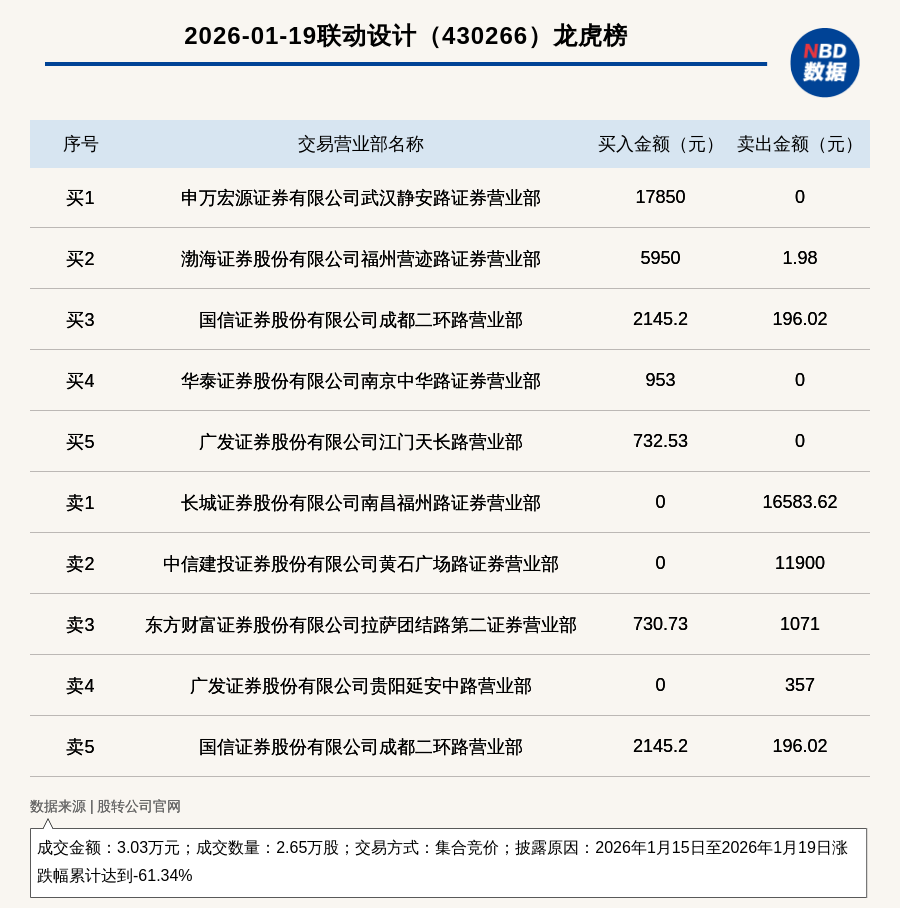 每经讯,2026年1月19日,新三板创新层公司联动设计(430266,收盘价:0.92元)登上龙虎榜,交易方式是集合竞价,披露原因是2026年1月15日至2026年1月19日涨跌幅累计达到-61.34%,成交数量2.65万股,成交金额3.03万元。买一席位为申万宏源证券有限公司武汉静安路证券营业部,买入1.78万元;卖一席位为长城证券股份有限公司南昌福州路证券营业部,卖出1.66万元。