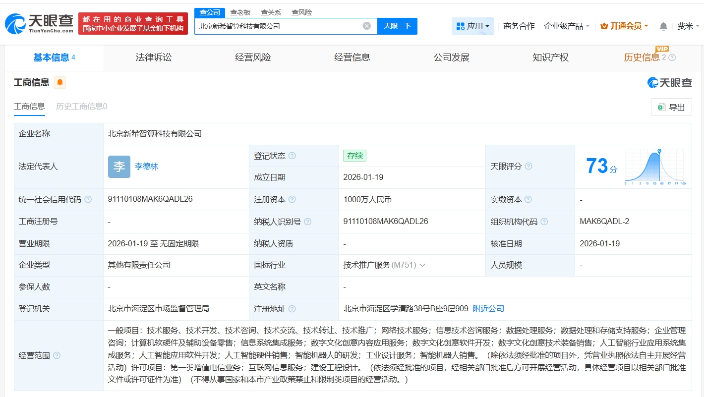 每经AI快讯,天眼查工商信息显示,近日,北京新希智算科技有限公司成立,法定代表人为李德林,注册资本1000万元人民币,经营范围包括人工智能行业应用系统集成服务、人工智能应用软件开发、人工智能硬件销售等。股权全景穿透图显示,该公司由中公教育(002607)旗下北京中公致远科技有限公司、深圳市芯核云启数字科技有限公司共同持股。