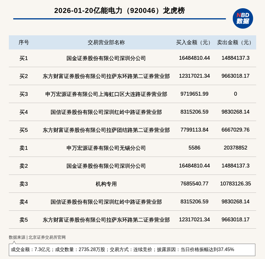 每经讯,2026年1月20日,北交所上市公司亿能电力(920046,收盘价:27.24元)登上龙虎榜,交易方式是连续竞价,披露原因是当日价格振幅达到37.45%,成交数量2735.28万股,成交金额7.3亿元。买一席位为国金证券股份有限公司深圳分公司,买入1648.48万元;卖一席位为申万宏源证券有限公司无锡分公司,卖出2037.89万元。