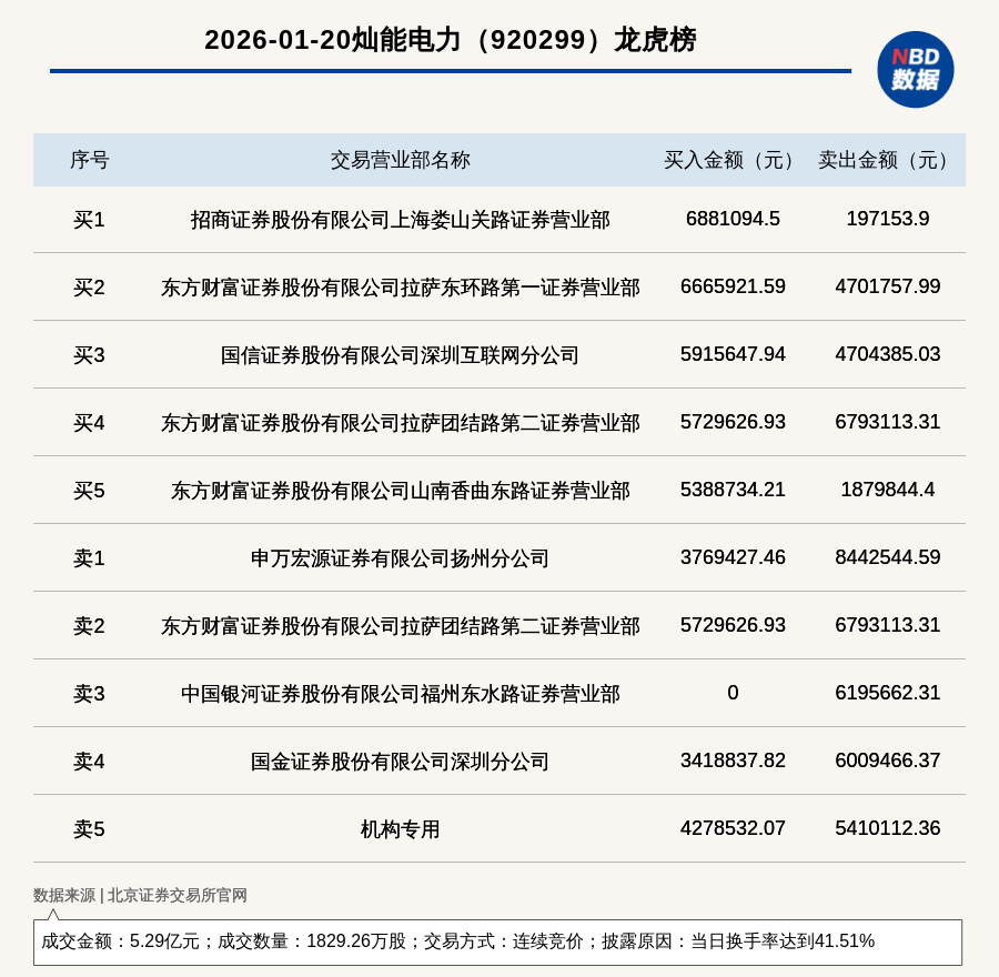 每经讯,2026年1月20日,北交所上市公司灿能电力(920299,收盘价:28.17元)登上龙虎榜,交易方式是连续竞价,披露原因是当日换手率达到41.51%,成交数量1829.26万股,成交金额5.29亿元。买一席位为招商证券股份有限公司上海娄山关路证券营业部,买入688.11万元;卖一席位为申万宏源证券有限公司扬州分公司,卖出844.25万元。