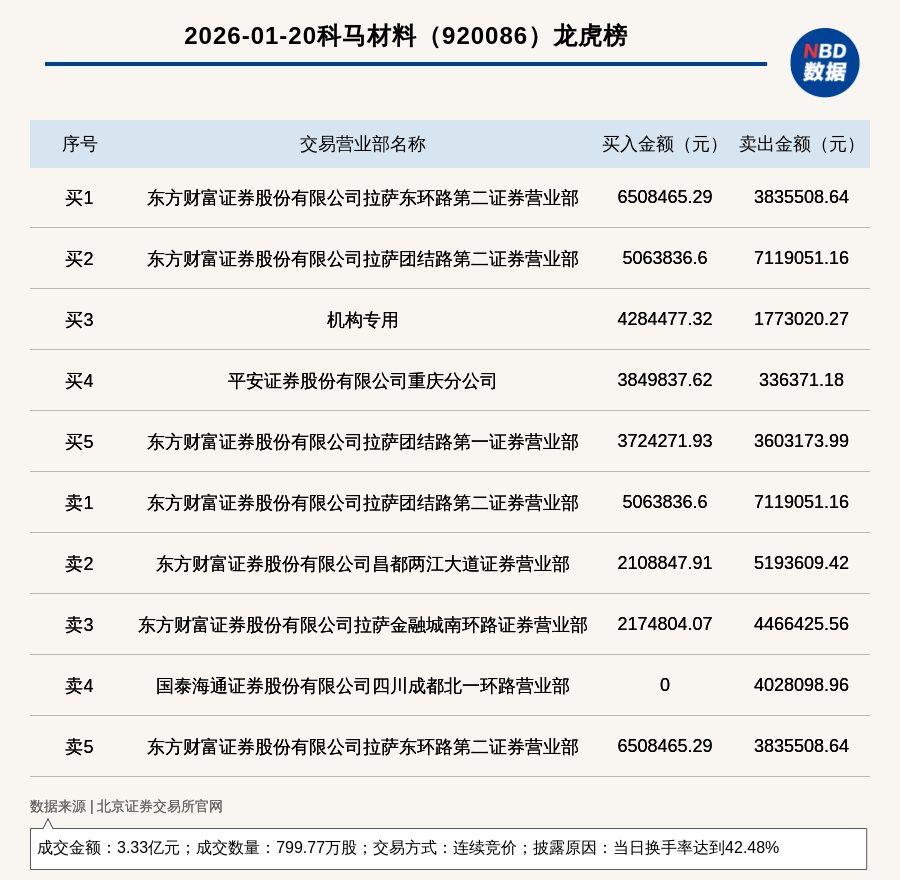 每经讯,2026年1月20日,北交所上市公司科马材料(920086,收盘价:41.49元)登上龙虎榜,交易方式是连续竞价,披露原因是当日换手率达到42.48%,成交数量799.77万股,成交金额3.33亿元。买一席位为东方财富证券股份有限公司拉萨东环路第二证券营业部,买入650.85万元;卖一席位为东方财富证券股份有限公司拉萨团结路第二证券营业部,卖出711.91万元。