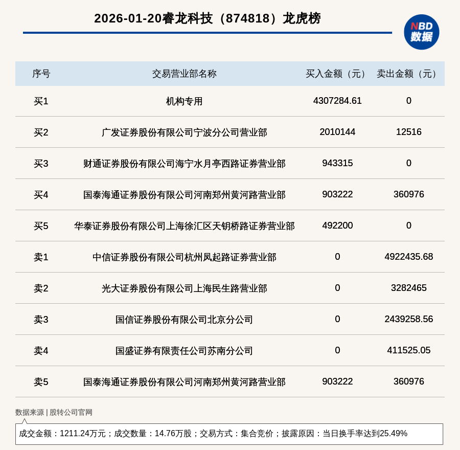 每经讯,2026年1月20日,新三板创新层公司睿龙科技(874818,收盘价:84元)登上龙虎榜,交易方式是集合竞价,披露原因是当日换手率达到25.49%,成交数量14.76万股,成交金额1211.24万元。买一席位为机构专用,买入430.73万元;卖一席位为中信证券股份有限公司杭州凤起路证券营业部,卖出492.24万元。