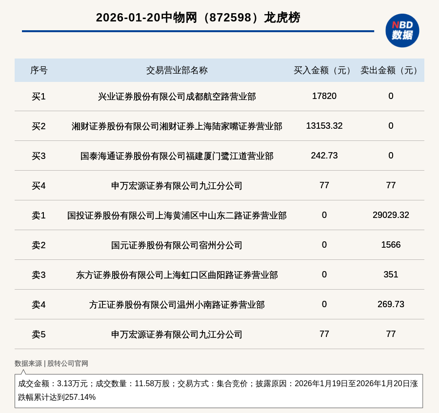 每经讯,2026年1月20日,新三板基础层公司中物网(872598,收盘价:0.5元)登上龙虎榜,交易方式是集合竞价,披露原因是2026年1月19日至2026年1月20日涨跌幅累计达到257.14%,成交数量11.58万股,成交金额3.13万元。买一席位为兴业证券股份有限公司成都航空路营业部,买入1.78万元;卖一席位为国投证券股份有限公司上海黄浦区中山东二路证券营业部,卖出2.9万元。