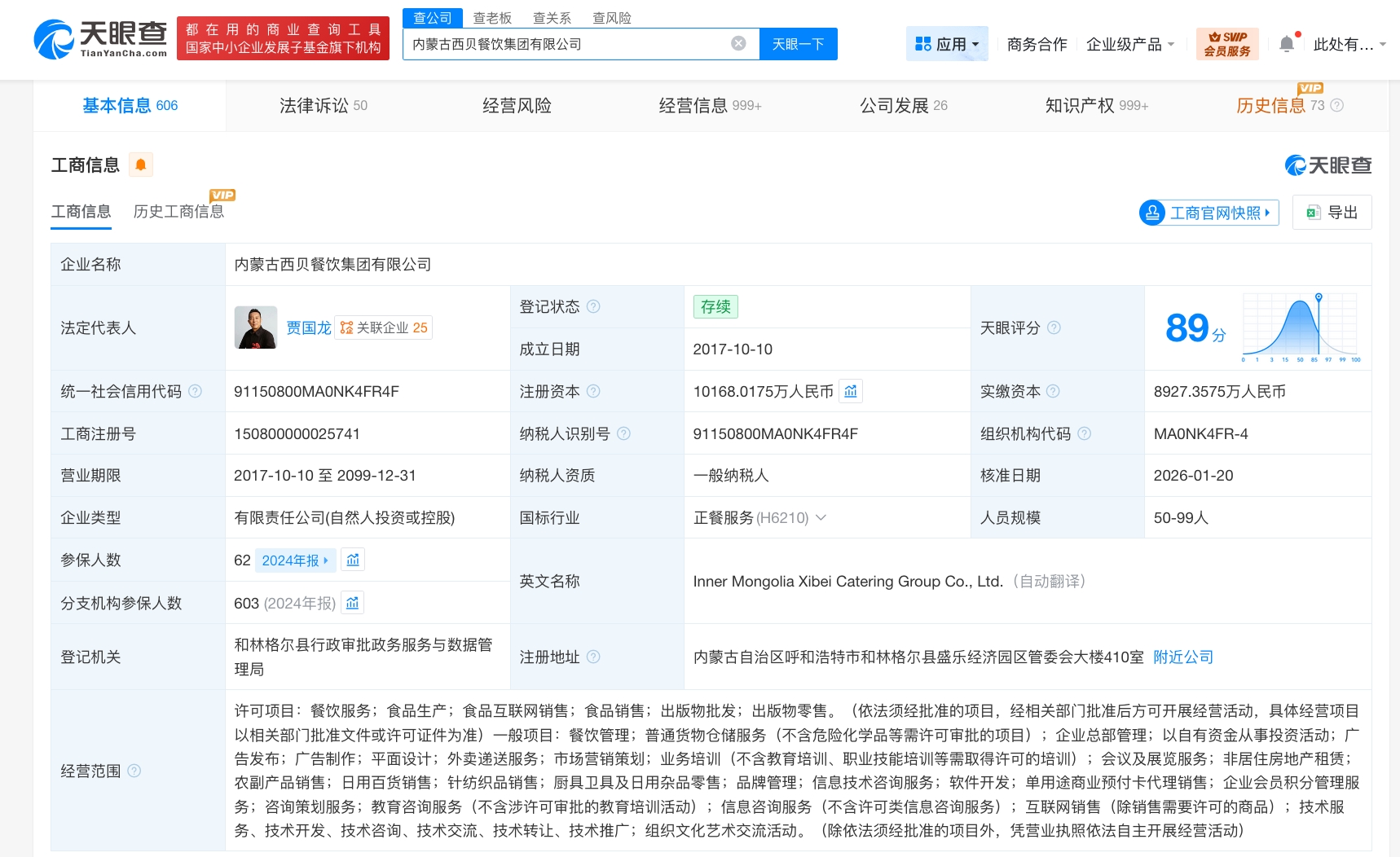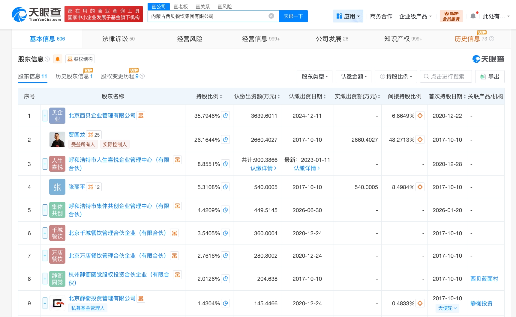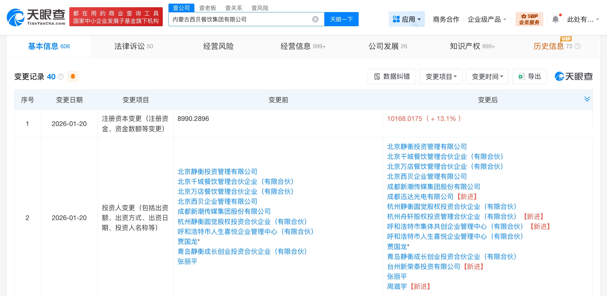 每经AI快讯,天眼查工商信息显示,近日,内蒙古西贝餐饮集团有限公司发生工商变更,新增台州新荣泰投资有限公司、呼和浩特市集体共创企业管理中心(有限合伙)、杭州舟轩股权投资管理合伙企业(有限合伙)等为股东,同时,注册资本由约8990.3万元人民币增至约1.02亿元人民币,增幅约13%。内蒙古西贝餐饮集团有限公司成立于2017年10月,法定代表人为贾国龙,经营范围含餐饮服务、食品生产、食品互联网销售、食品销售、餐饮管理、企业总部管理、以自有资金从事投资活动等。股东信息显示,该公司由北京西贝企业管理有限公司、贾国龙、呼和浩特市人生喜悦企业管理中心(有限合伙)等共同持股。