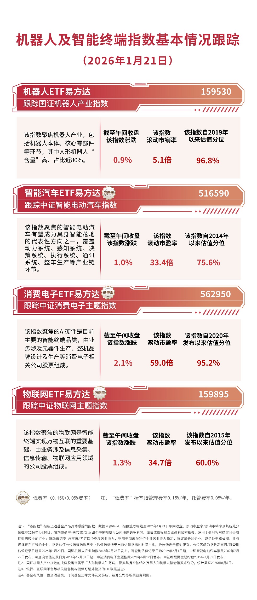 截至午间收盘,国证机器人产业指数上涨0.9%,中证智能电动汽车指数上涨1.0%,中证物联网主题指数上涨1.3%,中证消费电子主题指数上涨2.1%,机器人ETF易方达(159530)半日净申购近2000万份。