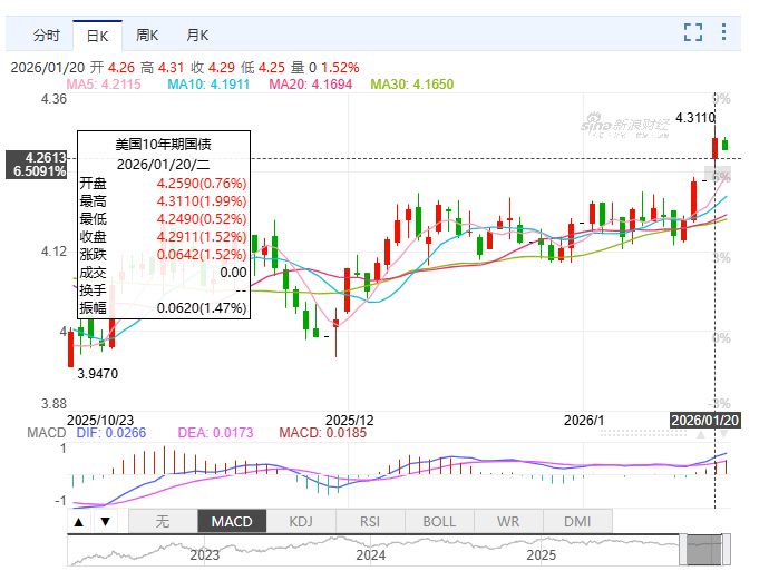 1月20日,美国三大指数集体收跌,道指狂泄近900点,标普500指数和纳指重挫逾2%。其中,标普500指数不仅抹去了今年以来的全部涨幅,更创下三个多月来的最大单日跌幅。衡量市场恐慌程度的VIX指数飙升至去年11月以来最高水平。与此同时,避险情绪推动黄金价格突破每盎司4700美元的历史新高;美元指数下跌0.41%。1月21日,黄金再创新高,首次站上每盎司4800美元关口。