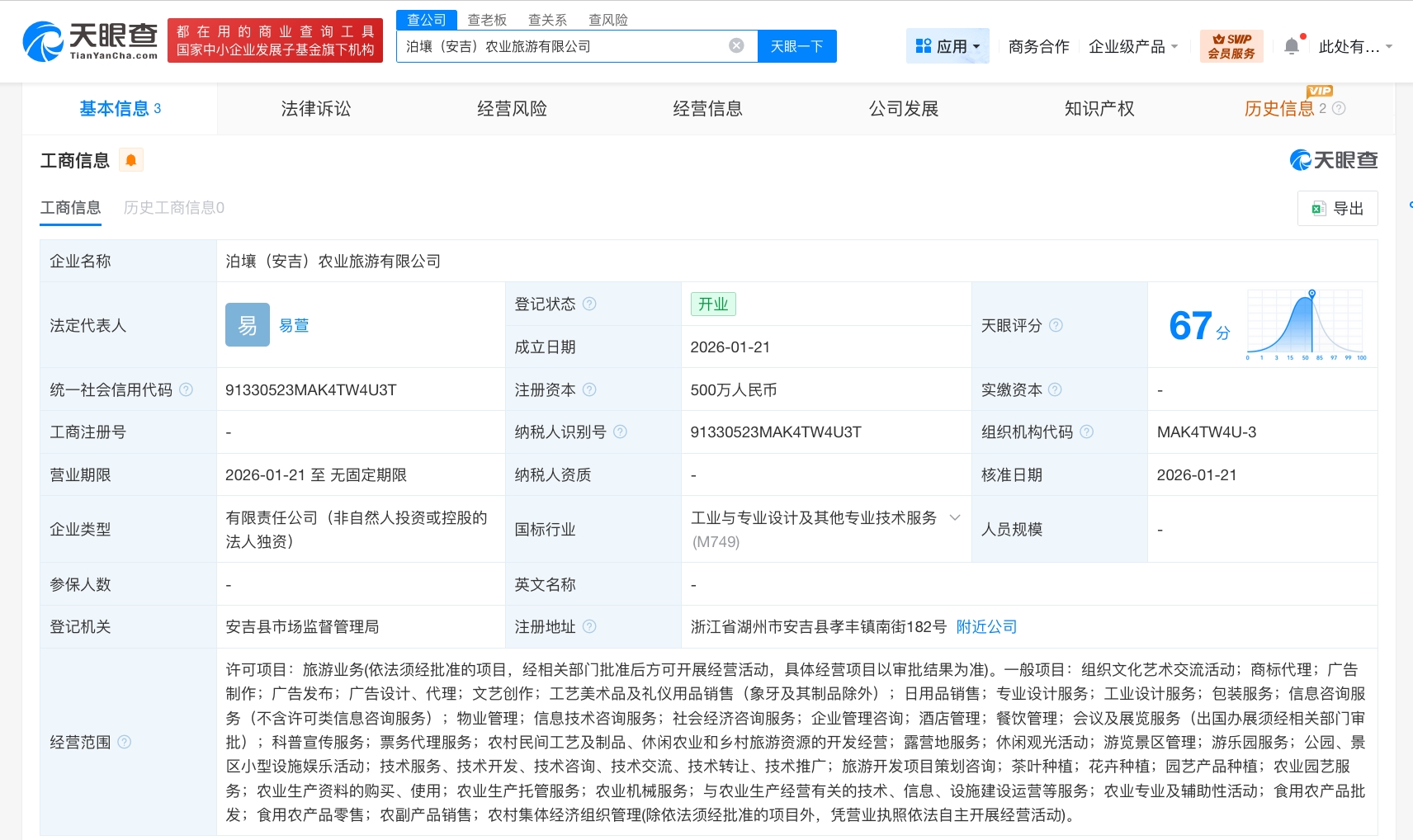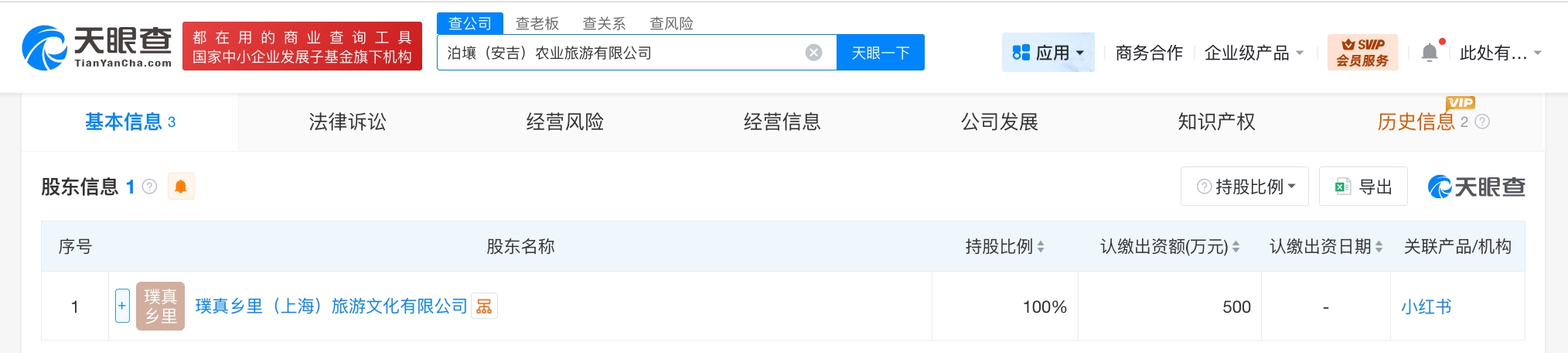 每经AI快讯,天眼查工商信息显示,近日,泊壤(安吉)农业旅游有限公司成立,法定代表人为易萱,注册资本500万元人民币,经营范围含旅游业务、组织文化艺术交流活动、商标代理、广告制作、信息咨询服务、信息技术咨询服务、社会经济咨询服务、企业管理咨询、票务代理服务等。股东信息显示,该公司由小红书旗下璞真乡里(上海)旅游文化有限公司全资持股。