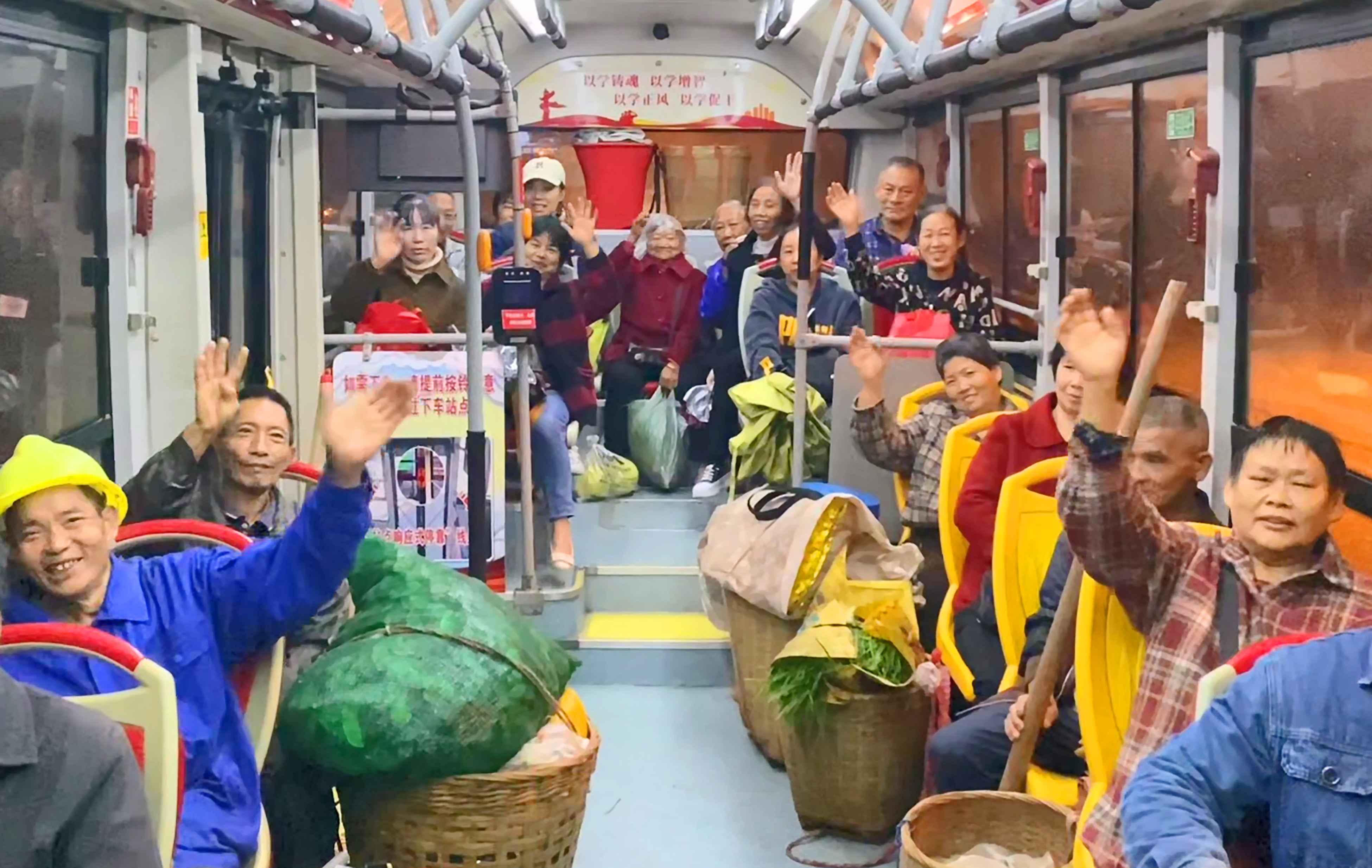这趟往返于城区和乡镇之间的“果蔬公交”车上,车厢里堆满了冬笋、柑橘、柚子、蔬菜等农特产品,村民们聊着家常,一路向着城区进发。中午时分,卖完菜的村民又背着采购的年货、生活用品返程。