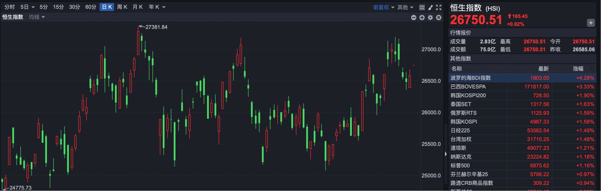 截至发稿,恒生指数报26750.51点,上涨165.45点,涨幅0.62%。