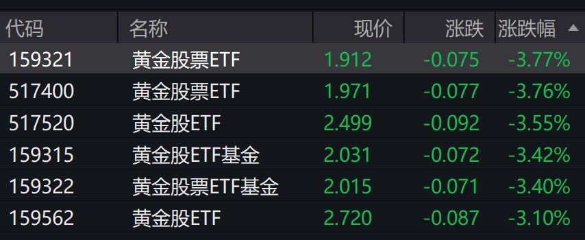 受盘面影响,黄金股相关ETF跌超3%。