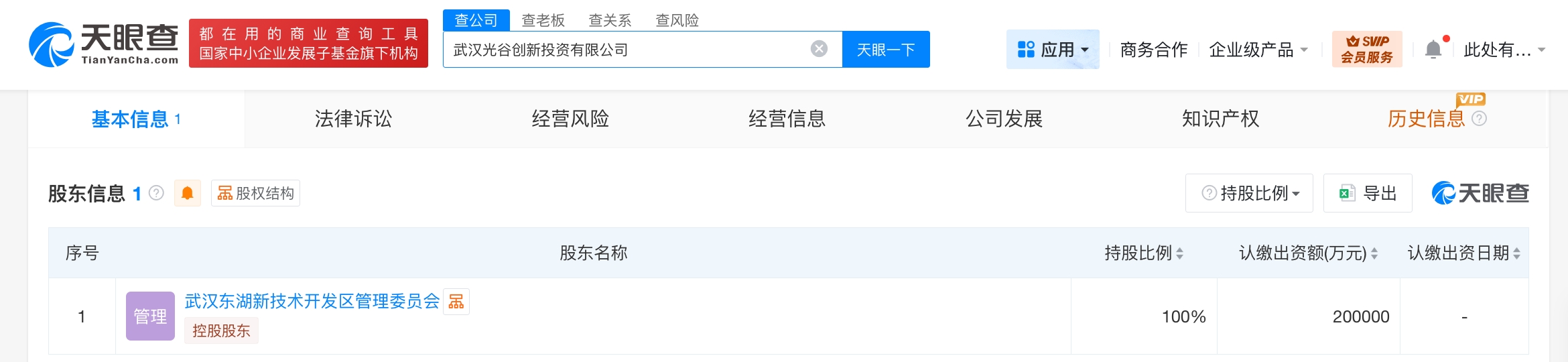 每经AI快讯,天眼查工商信息显示,近日,武汉光谷创新投资有限公司成立,法定代表人为杨少丹,注册资本20亿元人民币,经营范围为以自有资金从事投资活动,自有资金投资的资产管理服务、创业投资。股东信息显示,该公司由武汉东湖新技术开发区管理委员会全资持股。