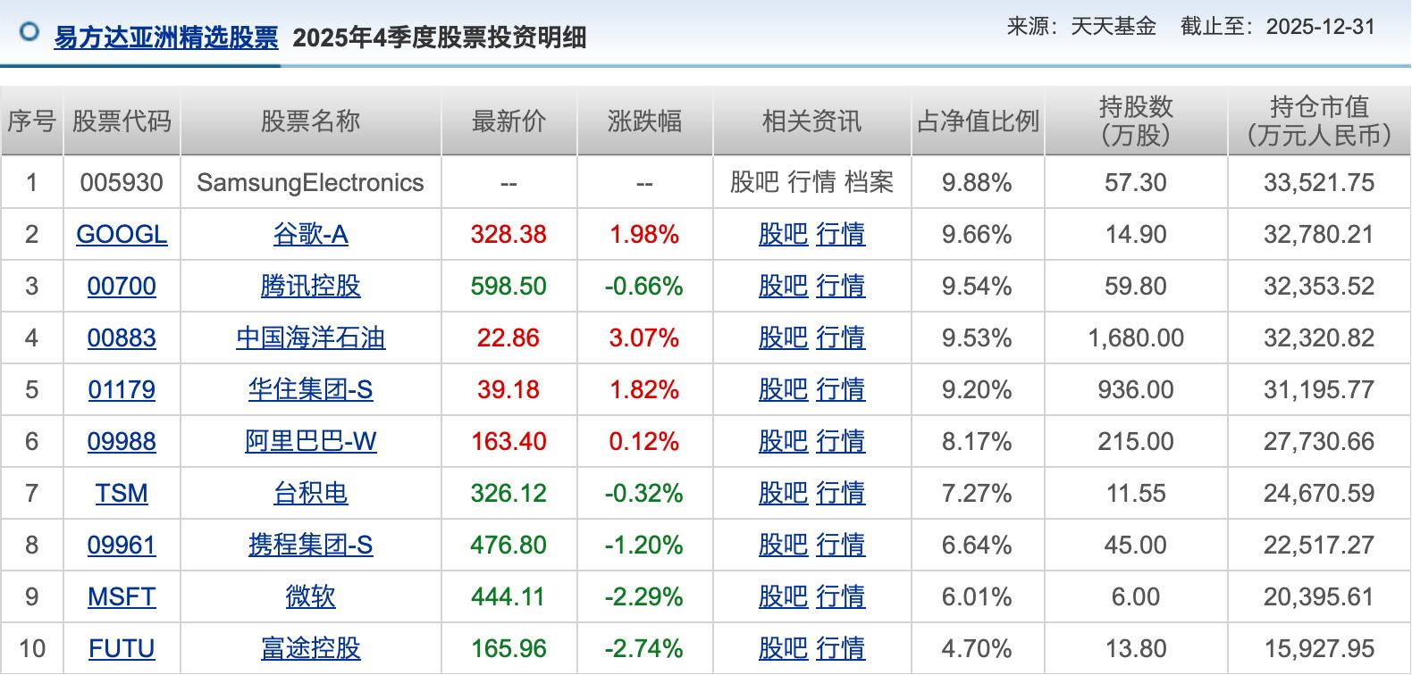 再看张坤管理的易方达亚洲精选,这只产品的前十大重仓股也很精彩。