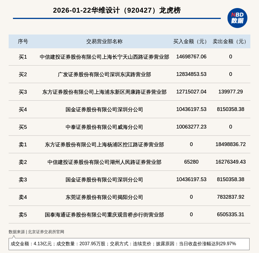 每经讯,2026年1月22日,北交所上市公司华维设计(920427,收盘价:23.68元)登上龙虎榜,交易方式是连续竞价,披露原因是当日收盘价涨幅达到29.97%,成交数量2037.95万股,成交金额4.13亿元。买一席位为中信建投证券股份有限公司上海长宁天山西路证券营业部,买入1469.88万元;卖一席位为东方证券股份有限公司上海杨浦区控江路证券营业部,卖出1849.88万元。