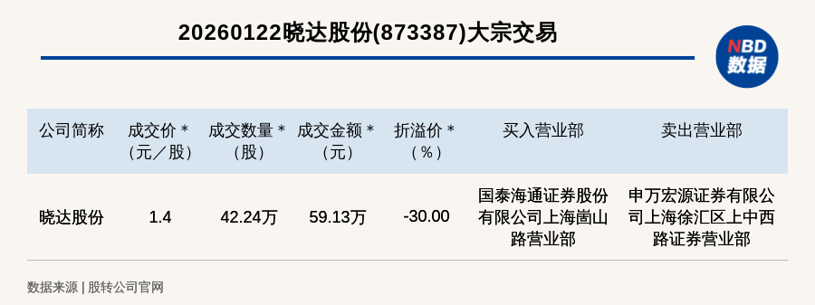 每经讯,2026年1月22日,新三板创新层公司晓达股份(873387,收盘价:2元)发生一笔大宗交易,成交价1.4元/股,成交数量42.24万股,成交金额59.13万元,折价30%。买入营业部是国泰海通证券股份有限公司上海崮山路营业部,卖出营业部是申万宏源证券有限公司上海徐汇区上中西路证券营业部。