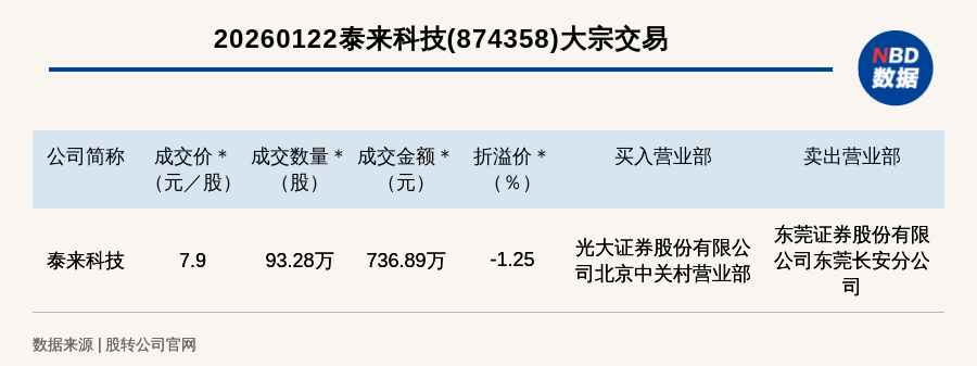 每经讯,2026年1月22日,新三板创新层公司泰来科技(874358,收盘价:8元)发生一笔大宗交易,成交价7.9元/股,成交数量93.28万股,成交金额736.89万元,折价1.25%。买入营业部是光大证券股份有限公司北京中关村营业部,卖出营业部是东莞证券股份有限公司东莞长安分公司。