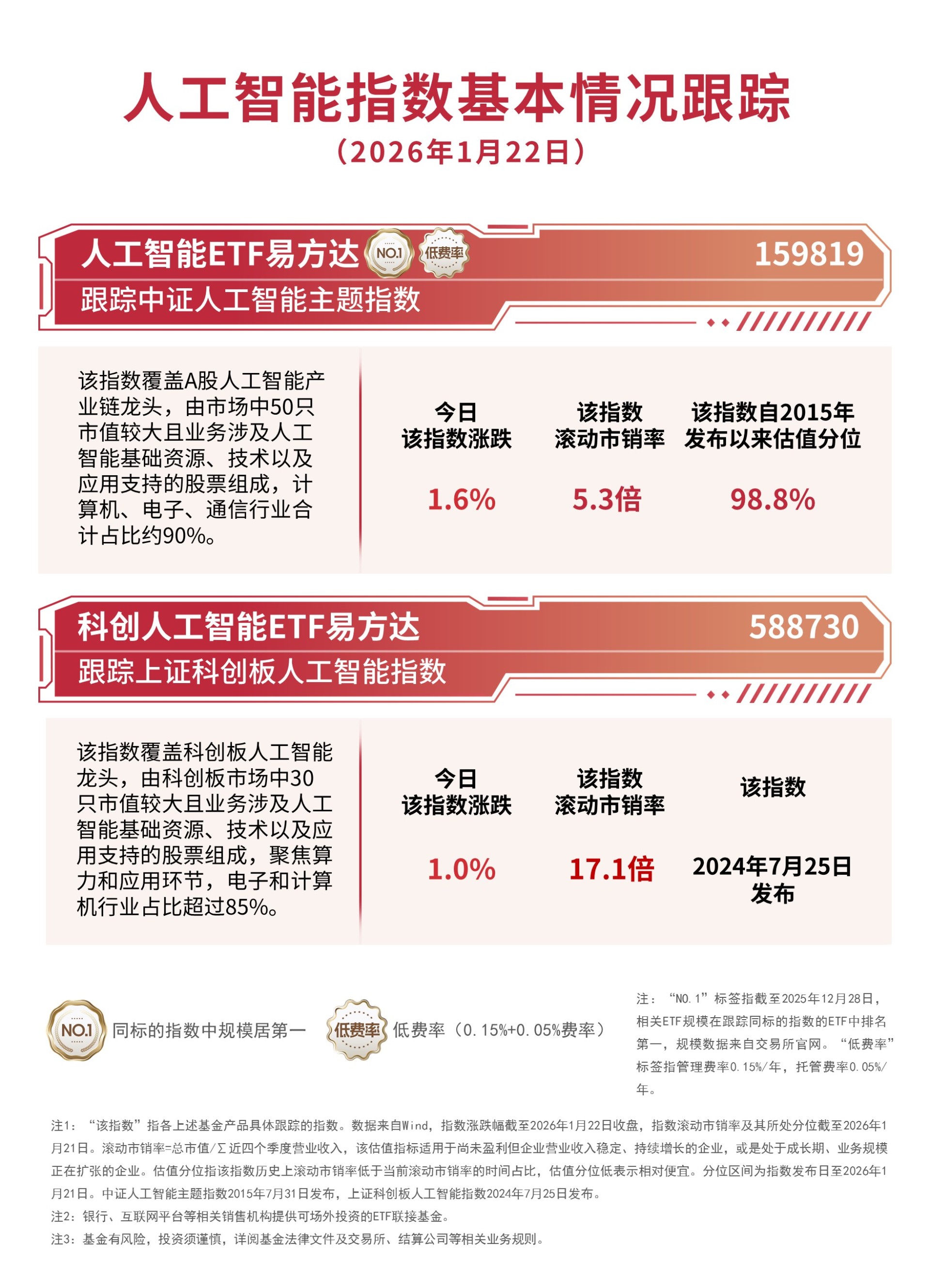 1月21日,AI产业链股局部活跃,CPO、集成电路等概念涨幅居前,截至收盘,中证人工智能主题指数上涨1.6%,上证科创板人工智能指数上涨1.0%。相关ETF受资金关注,Wind数据显示,人工智能ETF易方达(159819)近一周合计“吸金”超10亿元。