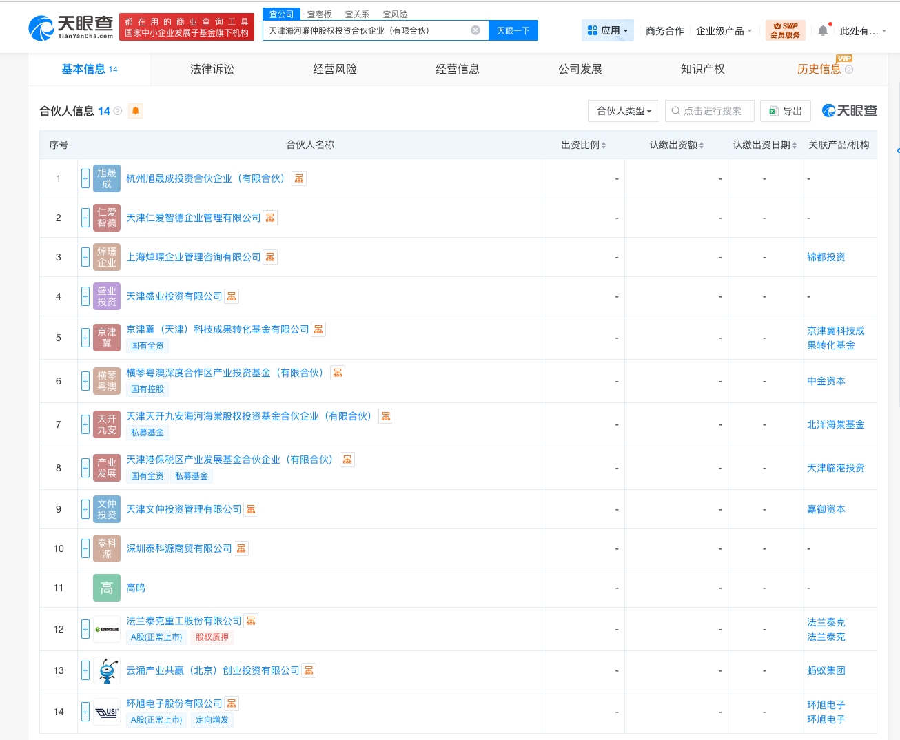 每经AI快讯,天眼查工商信息显示,近日,天津海河曜仲股权投资合伙企业(有限合伙)成立,执行事务合伙人为天津文仲投资管理有限公司,出资额约6.1亿元人民币,经营范围为以自有资金从事投资活动、投资管理。合伙人信息显示,该合伙企业由蚂蚁集团旗下云涌产业共赢(北京)创业投资有限公司、环旭电子(601231)、法兰泰克(603966)等共同出资。