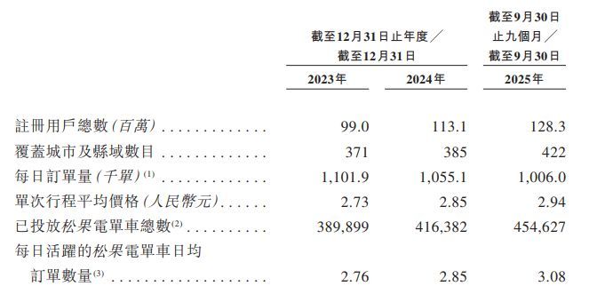 截至2025年三季度末,松果出行在全国422个市县共投放454627辆共享电单车,注册用户总数达1.283亿。但日均订单量已出现明显的下行趋势。从2023年的110.19万单下降至2024年的105.51万单,到了2025年前三季度进一步滑落至100.6万单。
