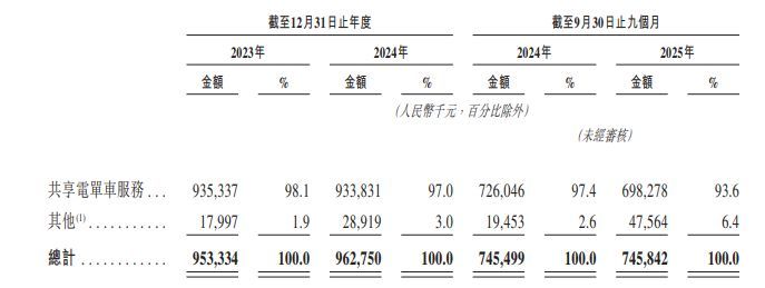 除了共享电单车服务外,公司还提供平台服务、透过应用程序提供广告、向运营合作伙伴及客户销售电单车及备件。不过,2023年、2024年和2025年前三季度(以下简称报告期内),松果出行的绝大部分收入来源均为共享电单车服务,收入占比分别为98.1%、97%和93.6%。