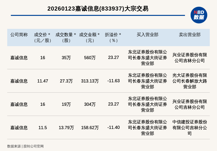 每经讯,2026年1月23日,新三板创新层公司嘉诚信息(833937,收盘价:12.98元)发生4笔大宗交易,总成交金额为1335.75万元,成交金额最高的一笔成交价16元/股,成交数量35万股,成交金额560万元,溢价23.27%。买入营业部是东北证券股份有限公司长春东盛大街证券营业部,卖出营业部是兴业证券股份有限公司吉林分公司。