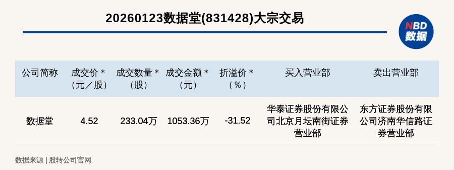 每经讯,2026年1月23日,新三板创新层公司数据堂(831428,收盘价:6.6元)发生一笔大宗交易,成交价4.52元/股,成交数量233.04万股,成交金额1053.36万元,折价31.52%。买入营业部是华泰证券股份有限公司北京月坛南街证券营业部,卖出营业部是东方证券股份有限公司济南华信路证券营业部。
