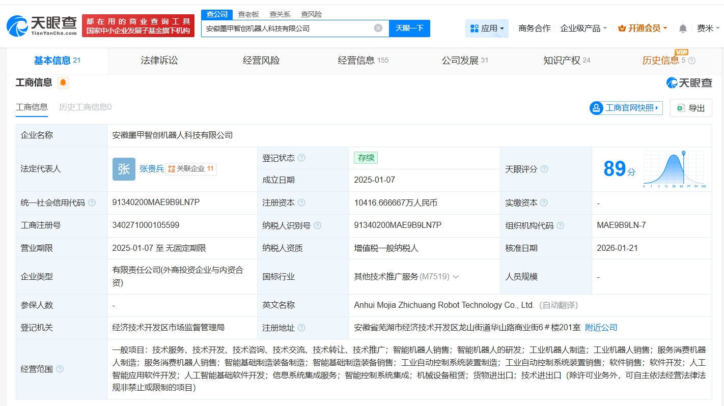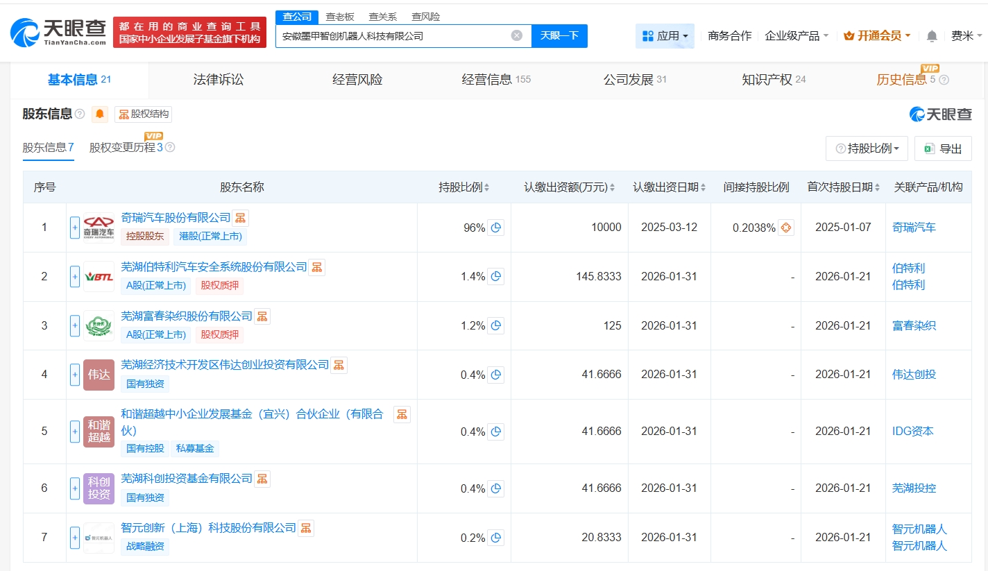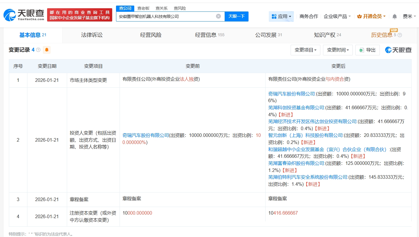 每经AI快讯,天眼查工商信息显示,近日,安徽墨甲智创机器人科技有限公司发生工商变更,新增伯特利(603596)、富春染织(605189)、智元机器人关联公司智元创新(上海)科技股份有限公司等为股东,同时,注册资本由1亿元人民币增至约1.04亿元人民币。安徽墨甲智创机器人科技有限公司成立于2025年1月,法定代表人为张贵兵,经营范围包括智能机器人销售、智能机器人的研发、工业机器人制造等。股东信息显示,该公司由奇瑞汽车(09973.HK)及上述新增股东共同持股。