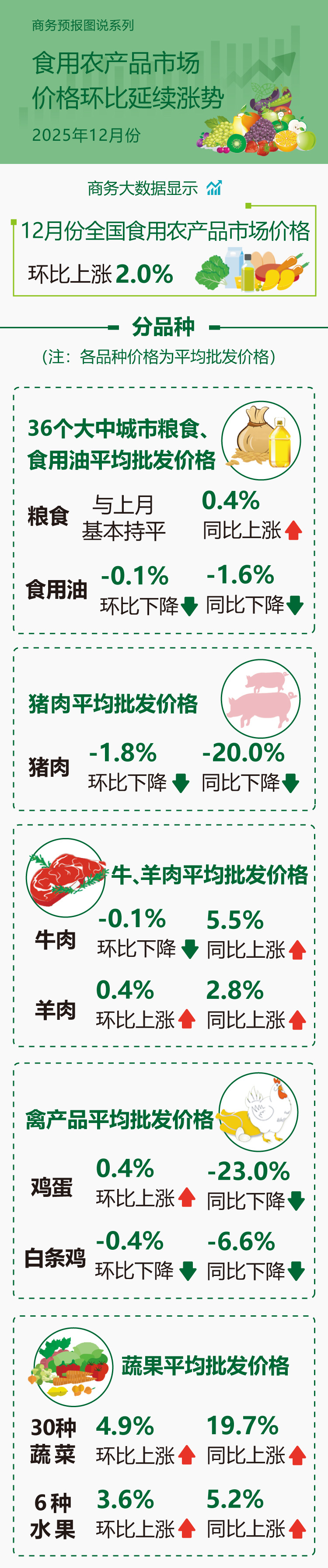 商务大数据显示,12月份全国食用农产品市场价格环比上涨2.0%,生产资料市场价格环比上涨1.5%。