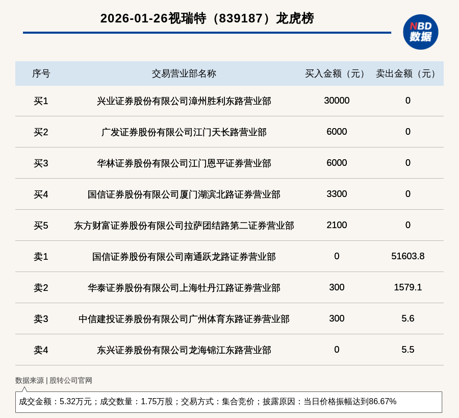 每经讯,2026年1月26日,新三板创新层公司视瑞特(839187,收盘价:5.5元)登上龙虎榜,交易方式是集合竞价,披露原因是当日价格振幅达到86.67%,成交数量1.75万股,成交金额5.32万元。买一席位为兴业证券股份有限公司漳州胜利东路营业部,买入3万元;卖一席位为国信证券股份有限公司南通跃龙路证券营业部,卖出5.16万元。