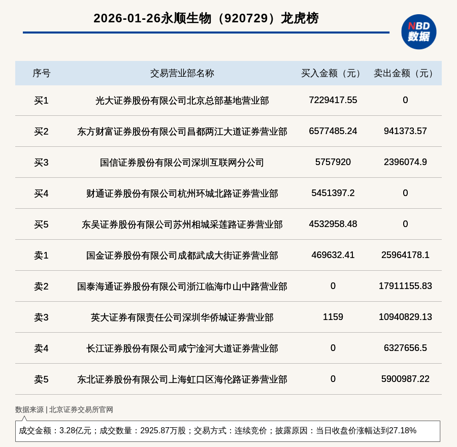 每经讯,2026年1月26日,北交所上市公司永顺生物(920729,收盘价:11.79元)登上龙虎榜,交易方式是连续竞价,披露原因是当日收盘价涨幅达到27.18%,成交数量2925.87万股,成交金额3.28亿元。买一席位为光大证券股份有限公司北京总部基地营业部,买入722.94万元;卖一席位为国金证券股份有限公司成都武成大街证券营业部,卖出2596.42万元。