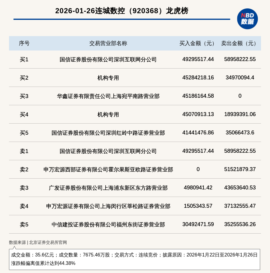 每经讯,2026年1月26日,北交所上市公司连城数控(920368,收盘价:50.31元)登上龙虎榜,交易方式是连续竞价,披露原因是2026年1月22日至2026年1月26日涨跌幅偏离值累计达到44.38%,成交数量7675.46万股,成交金额35.6亿元。买一席位为国信证券股份有限公司深圳互联网分公司,买入4929.55万元;卖一席位为国信证券股份有限公司深圳互联网分公司,卖出5895.82万元。