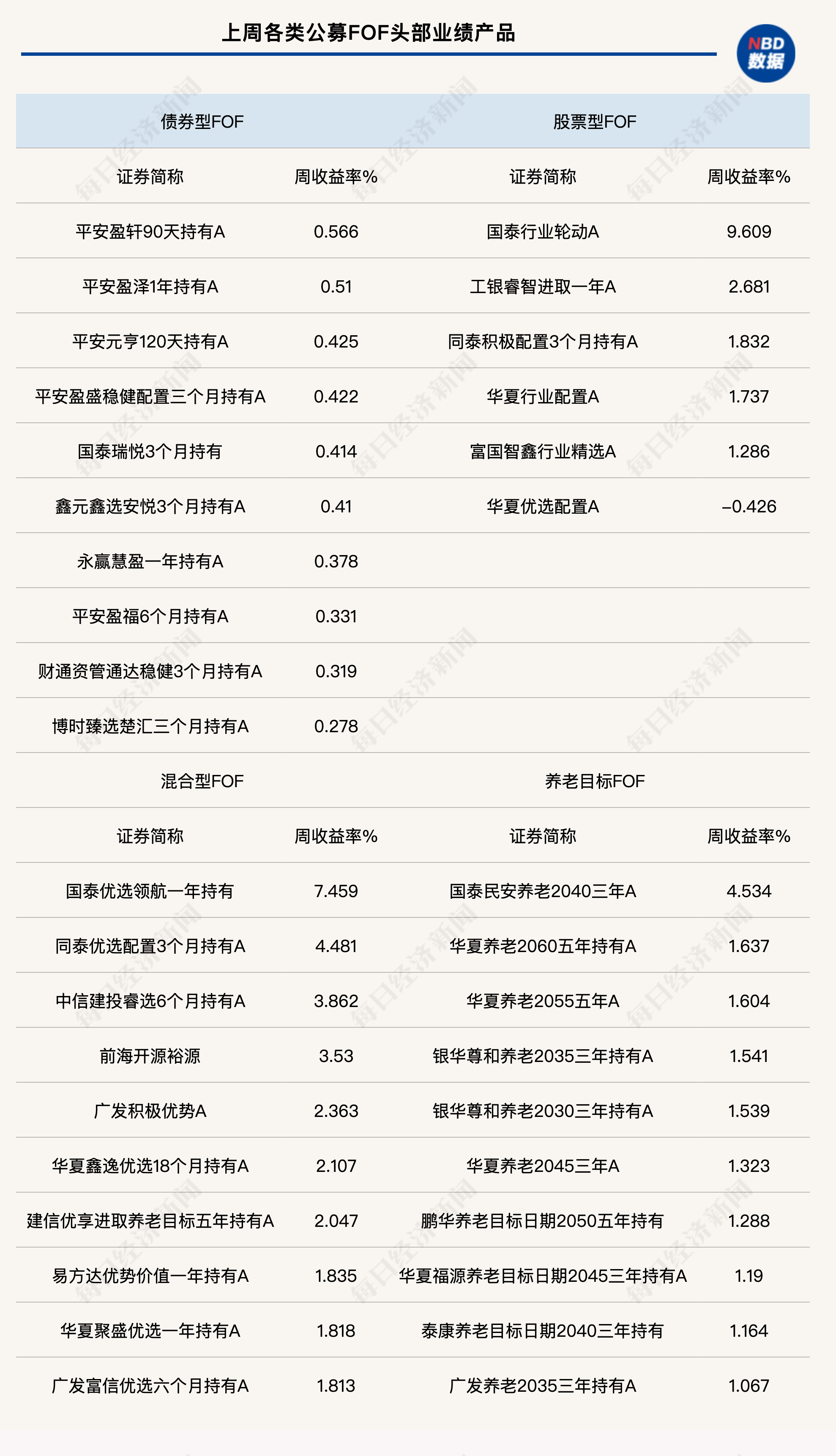 最后,简单盘点一下上周各类公募FOF的表现,股票型FOF中,上周收益最高的为国泰行业轮动A,单周上涨9.61%;混合型FOF中,上周收益最高的为国泰优选领航一年持有,单周上涨7.46%。