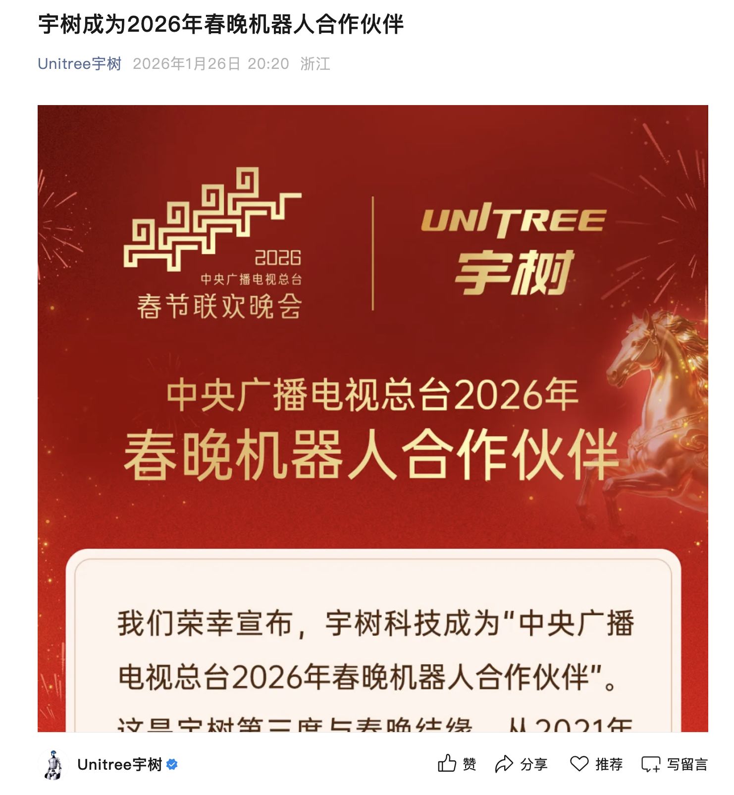 1月26日,宇树科技官宣成为2026年春晚机器人合作伙伴。从2021年牛年春晚机器牛"犇犇”的初次亮相,到去年由张艺谋导演执导的人形机器人《秧BOT》的"现象级"破圈,今年将是宇树第三度与春晚结缘。