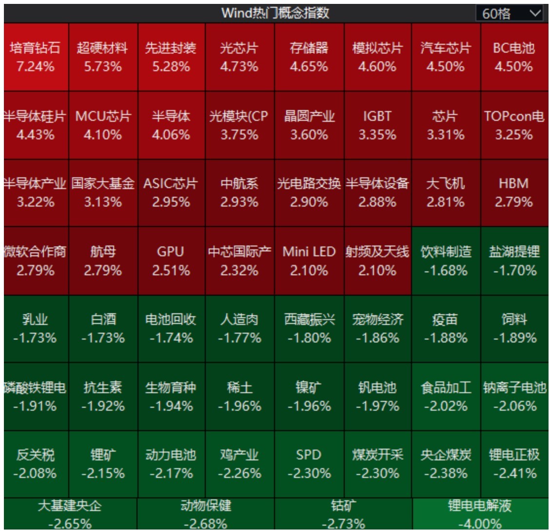 板块来看,芯片产业链、贵金属、CPO等领涨,太空光伏概念持续回升、超硬材料概念走强。下跌方面,煤炭、电池等板块跌幅居前。