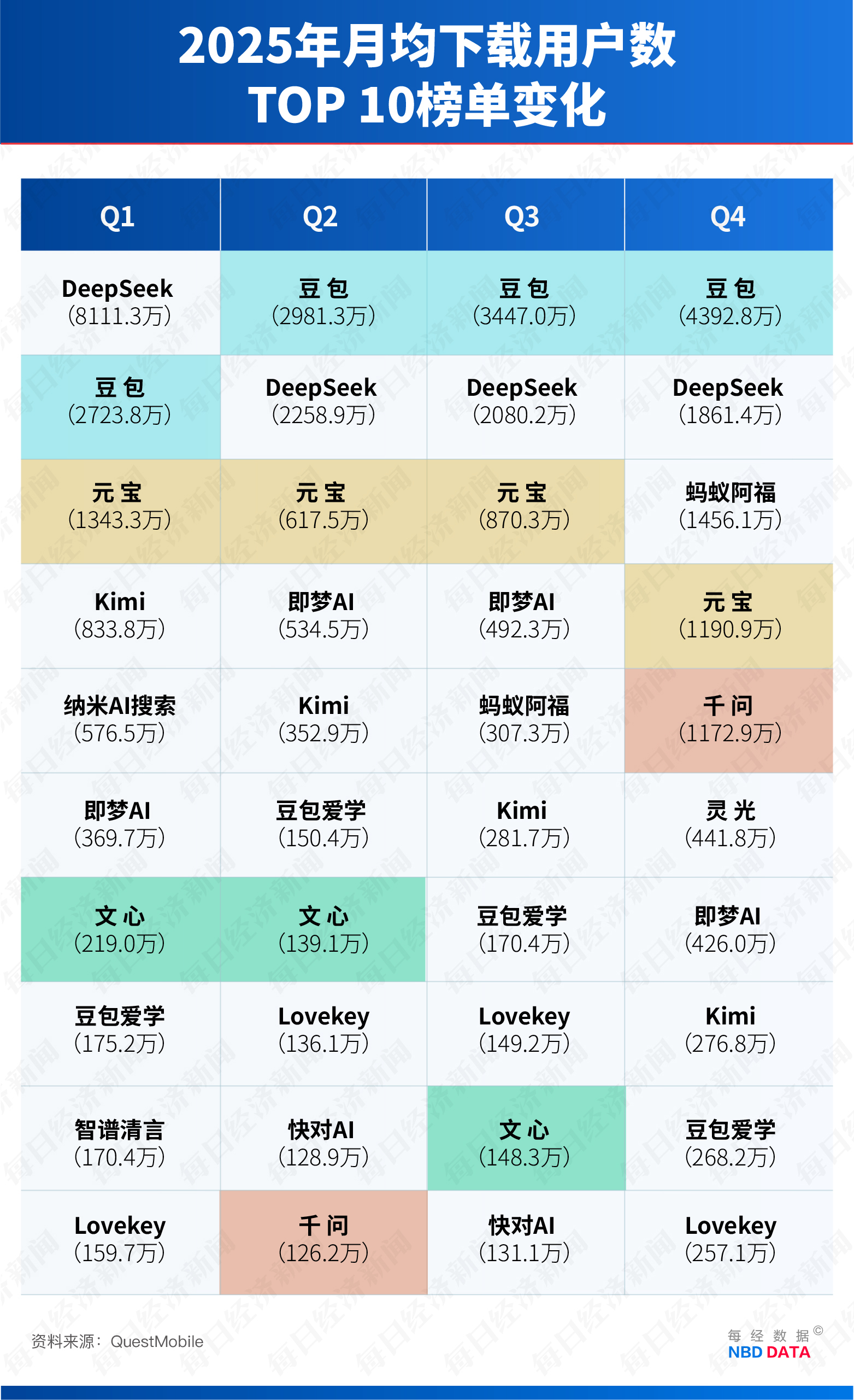 2025年,豆包月活翻倍至2.26亿,元宝稳坐第三,千问四季度实现900%的爆炸式增长,而文心跌出前十。
