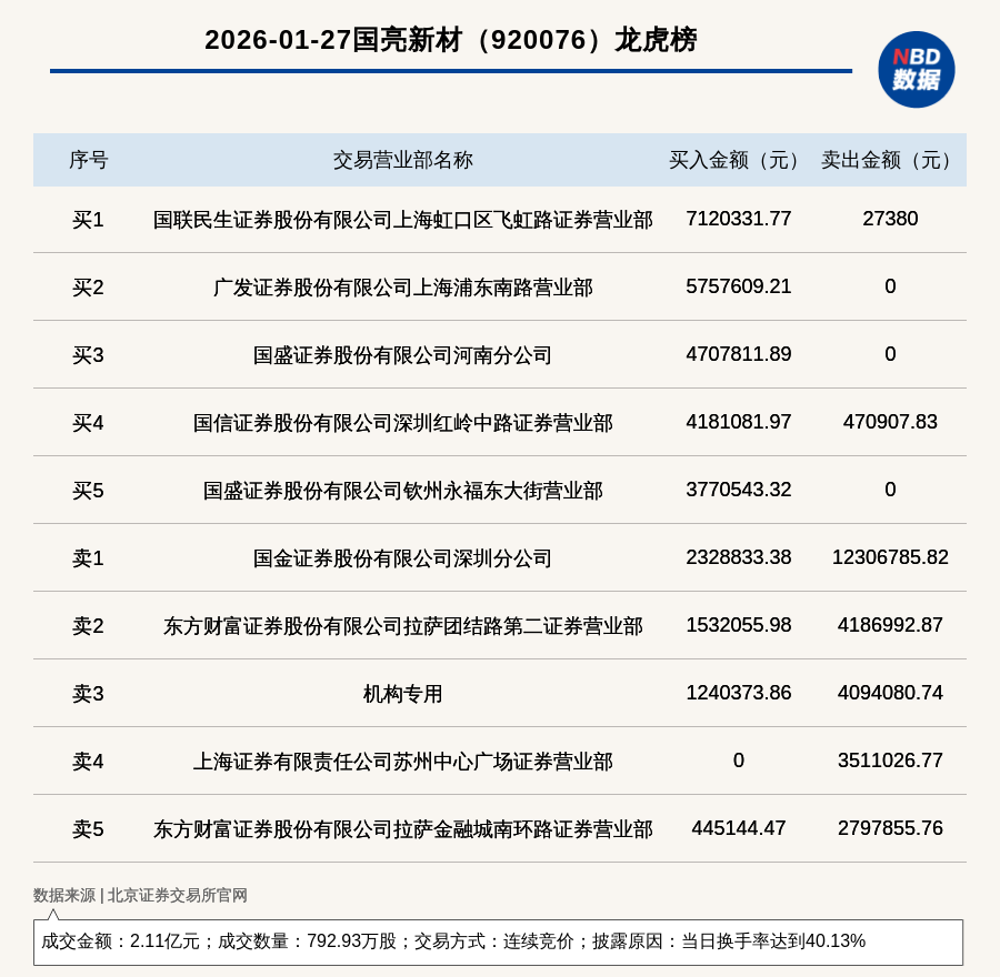 每经讯,2026年1月27日,北交所上市公司国亮新材(920076,收盘价:26.62元)登上龙虎榜,交易方式是连续竞价,披露原因是当日换手率达到40.13%,成交数量792.93万股,成交金额2.11亿元。买一席位为国联民生证券股份有限公司上海虹口区飞虹路证券营业部,买入712.03万元;卖一席位为国金证券股份有限公司深圳分公司,卖出1230.68万元。