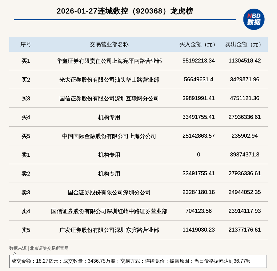 每经讯,2026年1月27日,北交所上市公司连城数控(920368,收盘价:59元)登上龙虎榜,交易方式是连续竞价,披露原因是当日价格振幅达到36.77%,成交数量3436.75万股,成交金额18.27亿元。买一席位为华鑫证券有限责任公司上海宛平南路营业部,买入9519.22万元;卖一席位为机构专用,卖出3937.44万元。