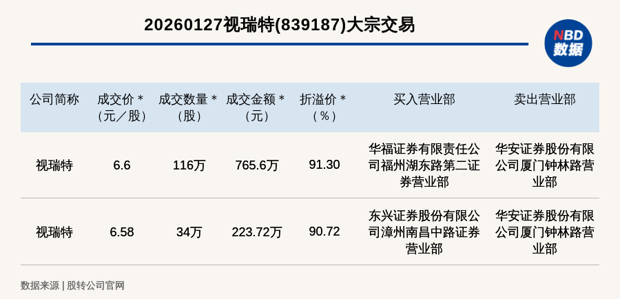 每经讯,2026年1月27日,新三板创新层公司视瑞特(839187,收盘价:3.45元)发生2笔大宗交易,溢价率最高的一笔成交价6.6元/股,成交数量116万股,成交金额765.6万元,溢价91.3%。买入营业部是华福证券有限责任公司福州湖东路第二证券营业部,卖出营业部是华安证券股份有限公司厦门钟林路营业部。