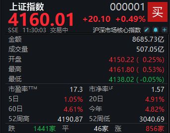 1月28日,A股窄幅整理,资源股呈现普涨格局。截至上午收盘,上证指数涨0.49%报4160.01点,深证成指涨0.09%,创业板指跌0.37%,北证50涨0.05%,科创50跌0.73%,中证A500涨0.45%,A股半日成交1.93万亿元。