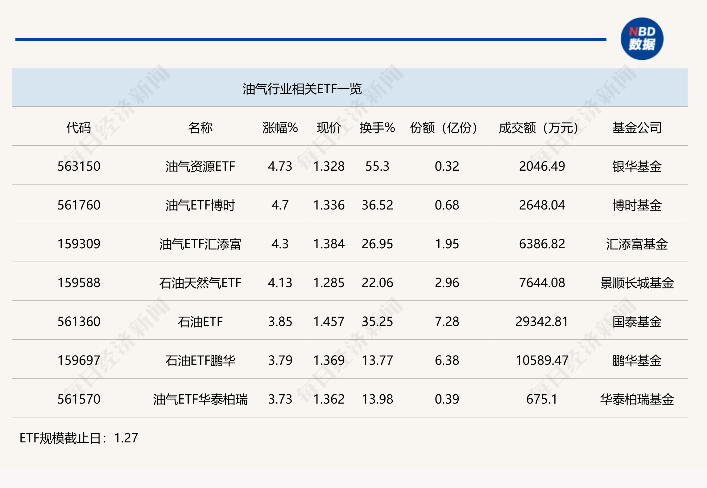 点评:油气资源ETF(563150)、油气ETF博时(561760)以及油气ETF汇添富(159309)今日上午涨幅均超过4%,其中,油气ETF汇添富(159309)规模相对较大,份额达到1.95亿份,其半日成交金额为6386.82万元。上述三只ETF均追踪的是中证油气资源指数。