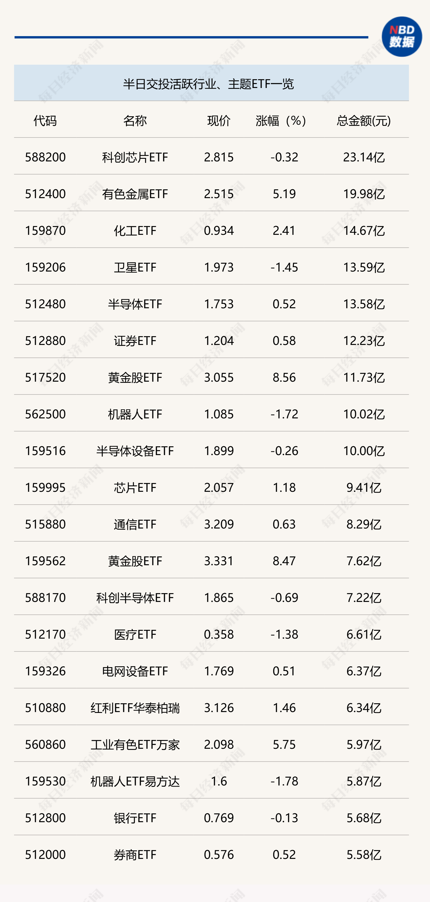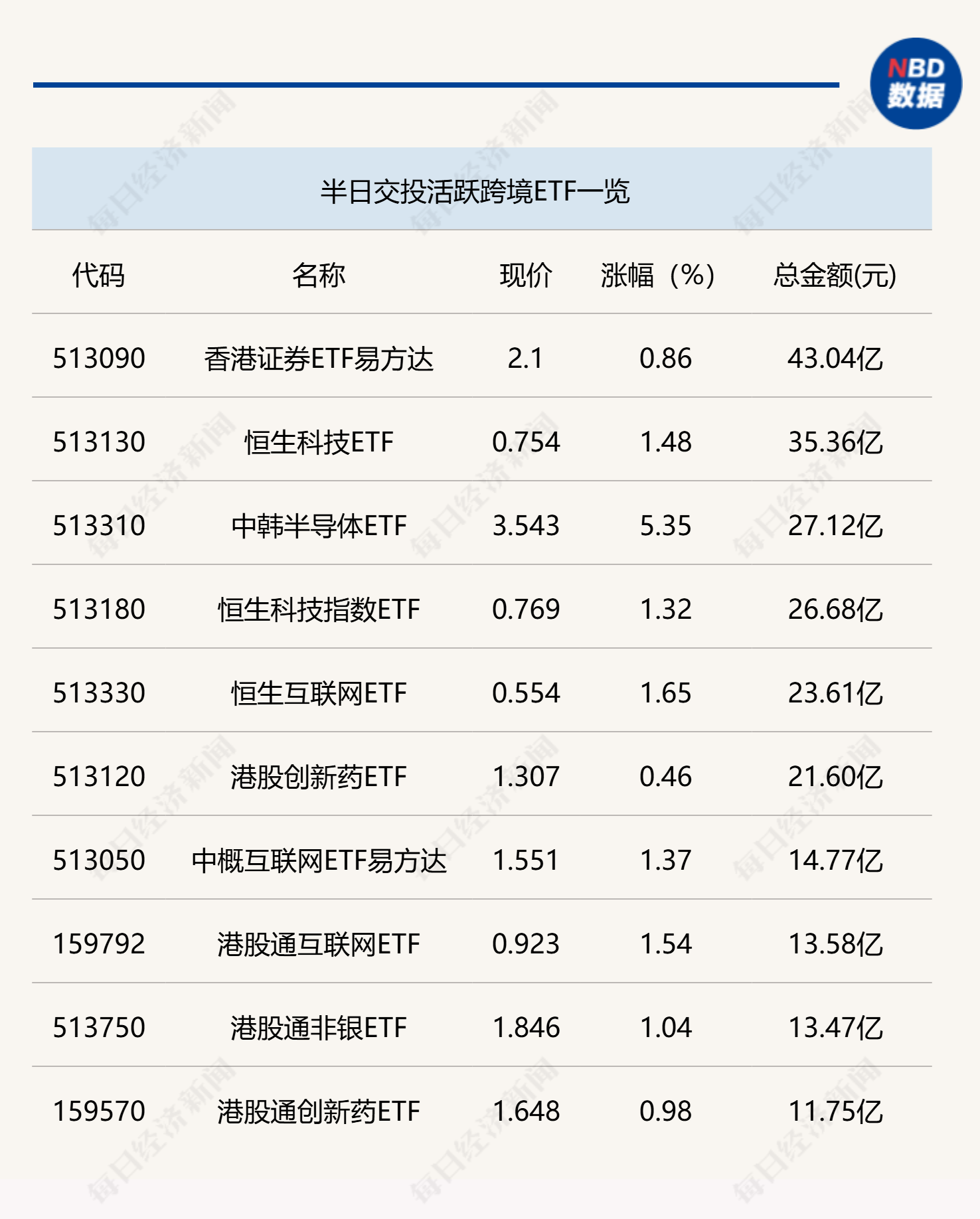 今日上午,行业、主题ETF整体交易活跃度降低,仅科创芯片ETF(588200)半日成交金额超过20亿元。跨境ETF方面,香港证券ETF易方达(513090)半日成交金额为43.04亿元,交易金额相对较大。