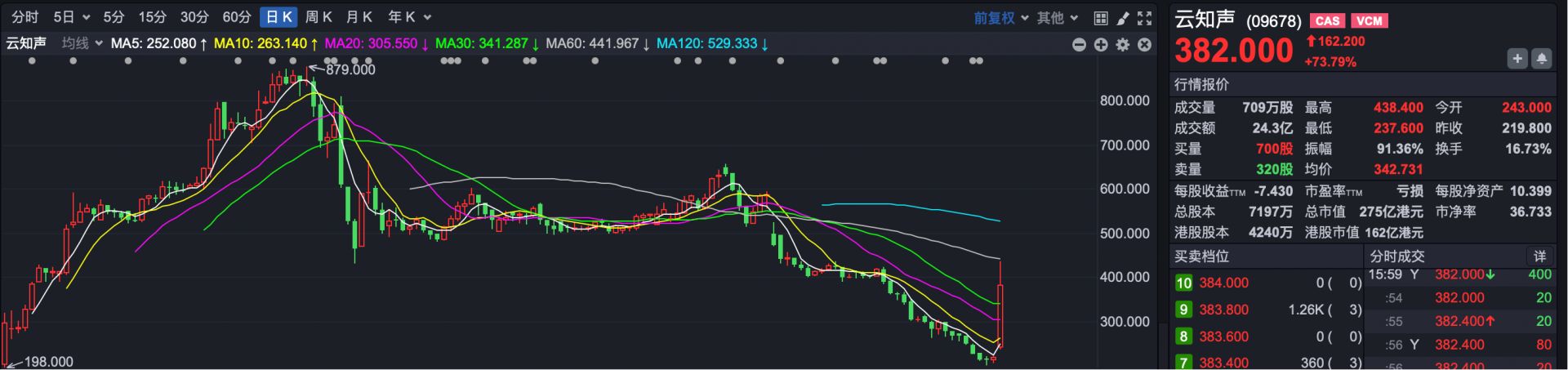 市场热点方面,云知声(HK09678)盘中一度大涨99%,收盘涨超73%。不过,云知声今日反弹之后,距离去年创下的879港元历史高点还有较大距离。