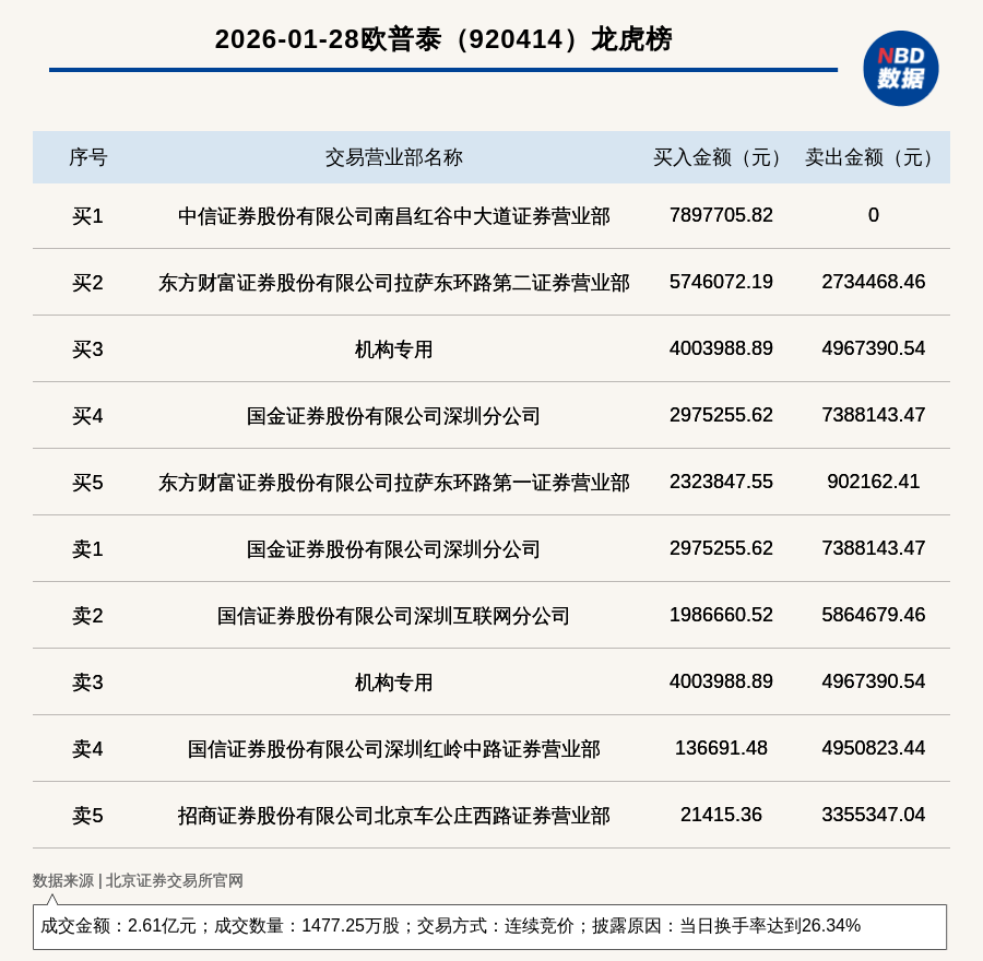 每经讯,2026年1月28日,北交所上市公司欧普泰(920414,收盘价:17.16元)登上龙虎榜,交易方式是连续竞价,披露原因是当日换手率达到26.34%,成交数量1477.25万股,成交金额2.61亿元。买一席位为中信证券股份有限公司南昌红谷中大道证券营业部,买入789.77万元;卖一席位为国金证券股份有限公司深圳分公司,卖出738.81万元。